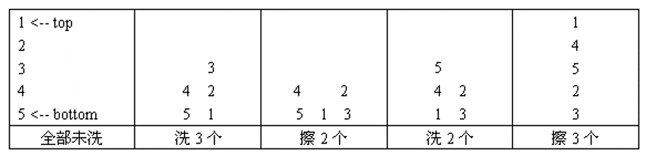 比如,有1,2,3,4,5号盘子,先洗3个,然后擦2个,再洗2个,再擦3个,最后盘子的序列是1,4,5,2,3。