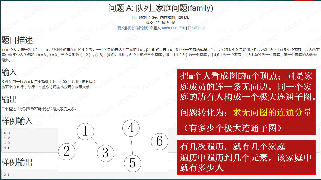 有 n 个人,编号为 1,2,……n,另外还知道存在 K 个关系。一个关系的表达为二元组(α,β)形式,表示α,β为同一家庭的成员。当 n,k 和 k 个关系给出之后,求出其中共有多少个家庭、最大的家庭中有多少人?例如:n=6,k=3,三个关系为(1,2),(1,3),(4,5)。此时,6 个人组成三个家庭,即:{1,2,3}为一个家庭,{4,5}为一个家庭,{6}单独为一个家庭,第一个家庭的人数为最多。