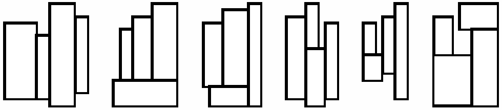 4个矩形块中任一个矩形的边都与封闭矩形的边相平行,图1显示出了铺放4个矩形块的6种方案。这6种方案是唯一可能的基本铺放方案。因为其它方案能由基本方案通过旋转和镜像反射得到。
