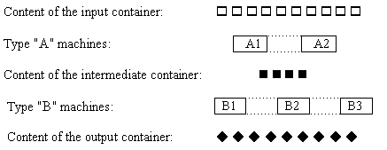 上图显示了按照下述方式工作的流水线的组织形式。A型机器从输入库接受工件,对其施加操作A,得到的中间产品存放在缓冲库。B型机器从缓冲库接受中间产品,对其施加操作B,得到的最终产品存放在输出库。所有的机器平行并且独立地工作,每个库的容量没有限制。每台机器的工作效率可能不同,一台机器完成一次操作需要一定的时间。